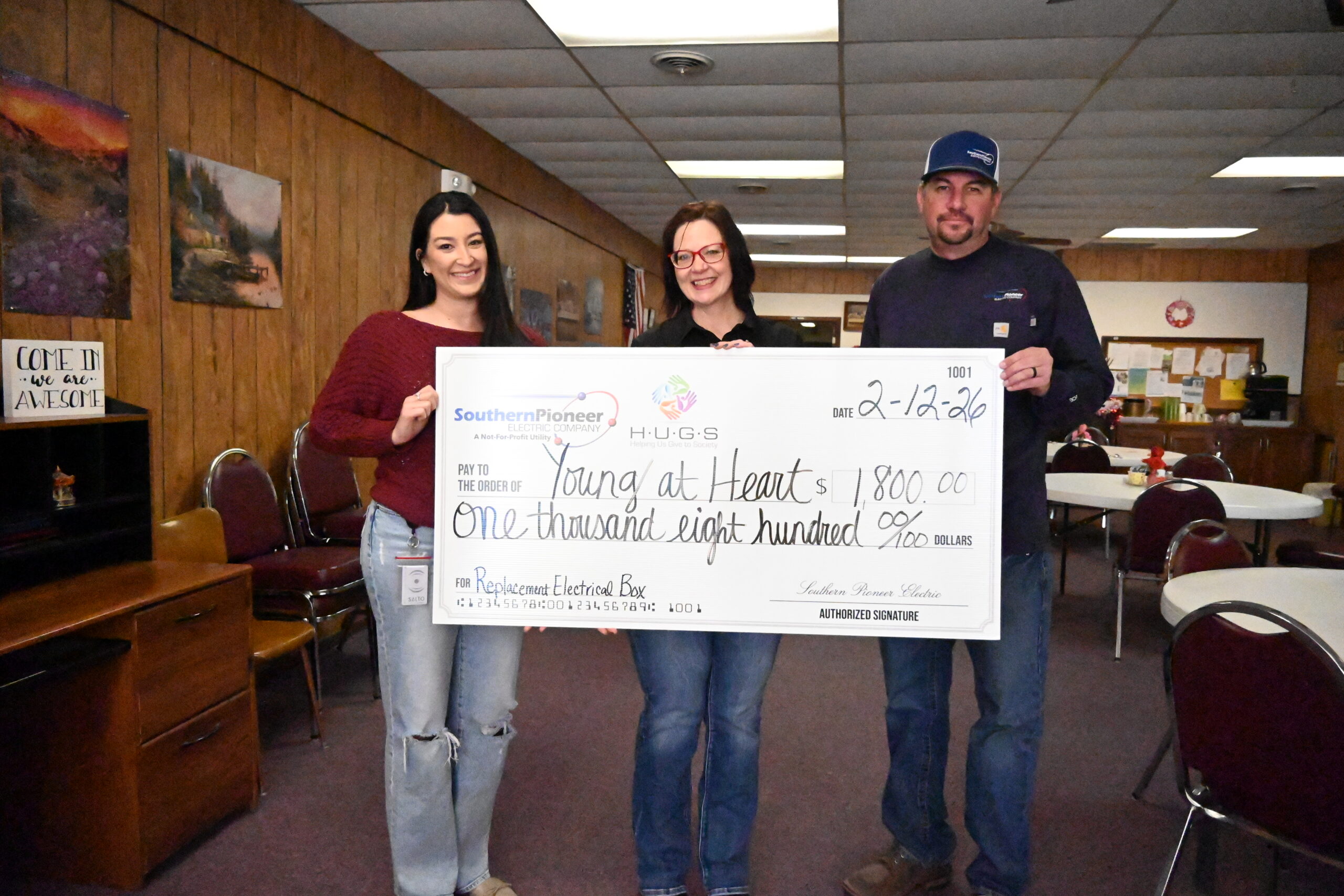 Representatives of the Southern Pioneer Electric Helping Us Give to Society (H.U.G.S.) program awarded a $1,800 grant to Young at Heart, Inc. on Thursday, February 12, 2026, to help the organization replace an electrical fuse box inside its building.